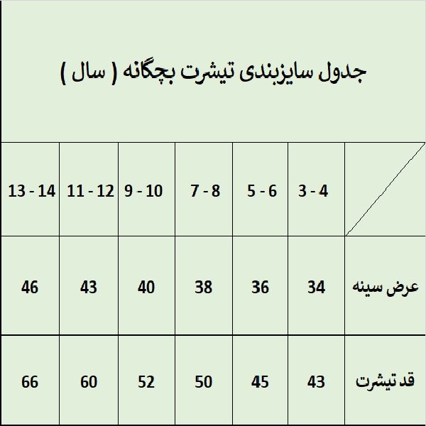 این محصول ترسه به نگار یک تیشرت آستین کوتاه بچگانه ( دخترانه و پسرانه ) است با طرح چاپی که ابعاد محصول مطابق جدول اندازه گیری در تصاویر محصول میباشد . این محصول از جنس سوپر پنبه بوده که مناسب کودکان عزیزمون هست و همچنین ثبات رنگ زیادی در پارچه و چاپ دارد. اندازه های در نظر گرفته شده برای این محصول برای دو سایز مناسب میباشد .