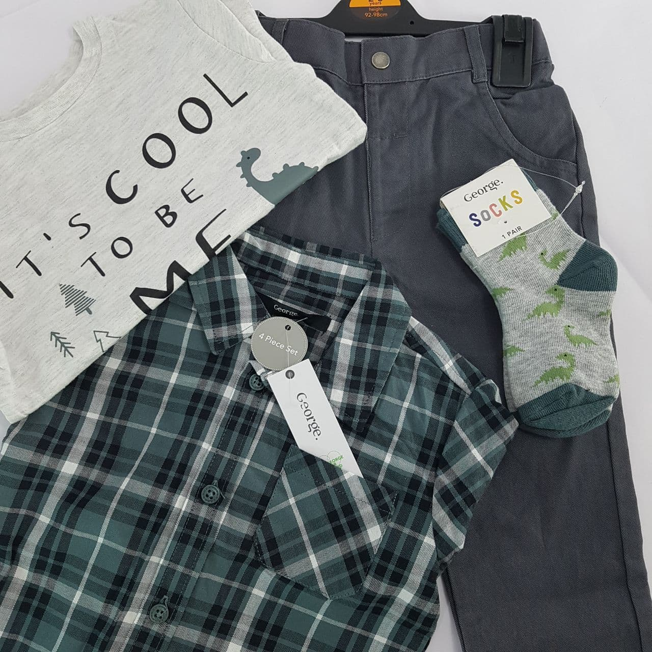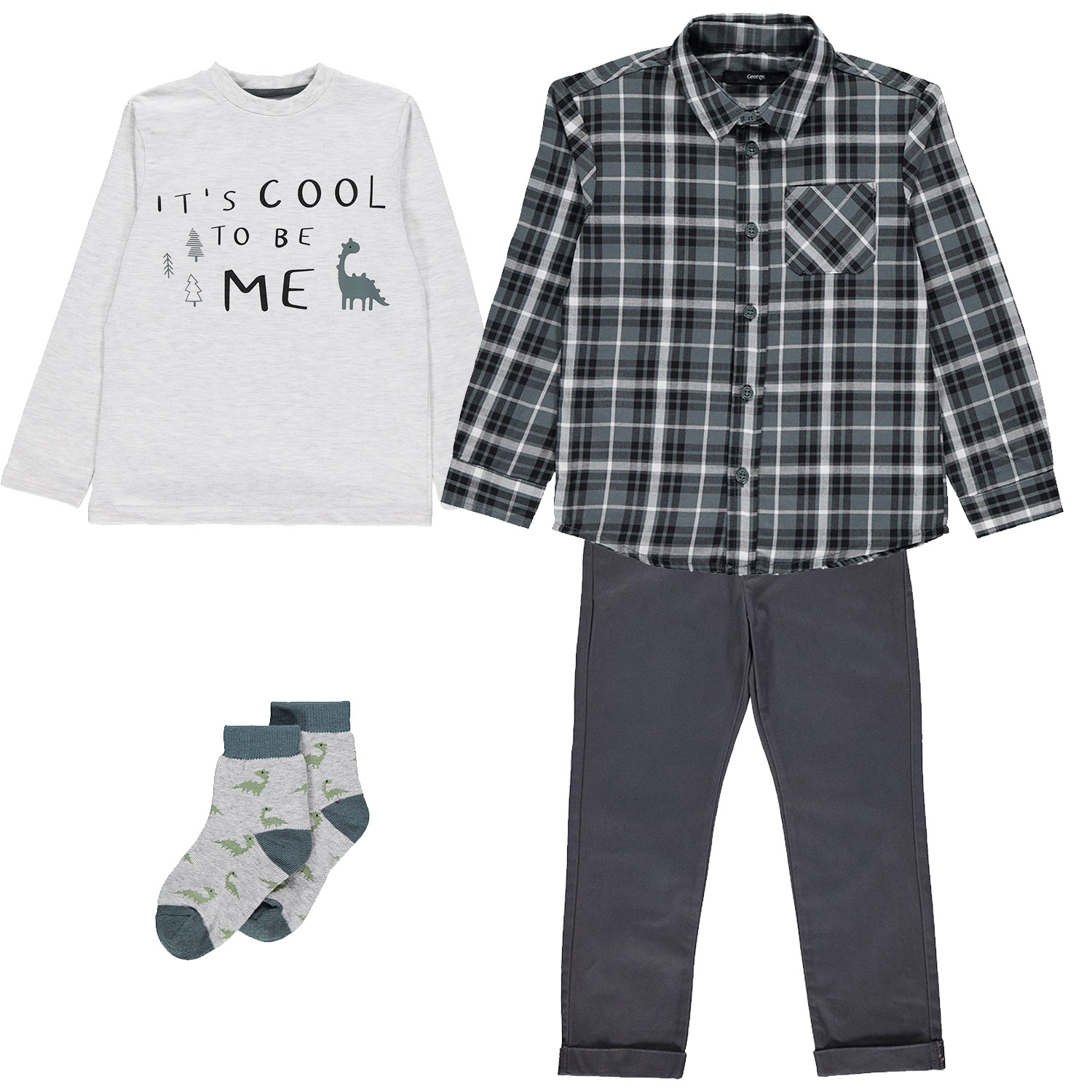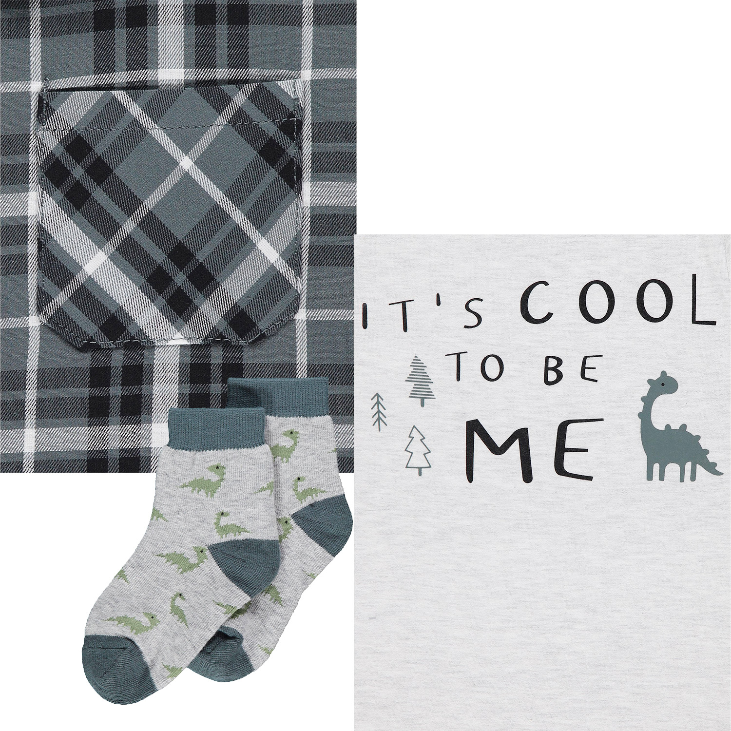- جزئیاتست پسرانه شامل: 1. تیشرت آستین دار طرح دایناسور 2. پیراهن چهارخانه 3. شلوار کتان طوسی 4. جوراب طرح دایناسور